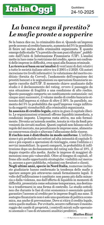 Un recente articolo, pubblicato su Italia Oggi da Matteo Rizzi, evidenzia con chiarezza un rischio concreto: quando il credito legale si ritira, cresce il pericolo dell’illegalità economica.
