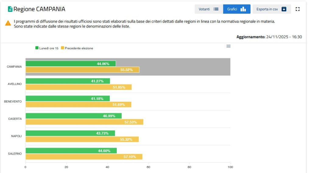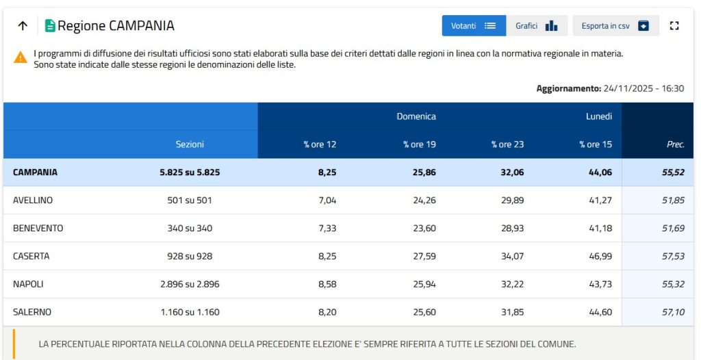 È del 44,06% l’affluenza alle urne totale per le elezioni regionali in Campania. Un’affluenza che è in calo rispetto alla precedente del 2020 quando alla stessa ore alle urne si era recato il 55,52% degli aventi diritto. In particolare a Salerno e provincia sono andati già a votare il 44,60% (contro l’57,10% della precedente tornata elettorale regionale).